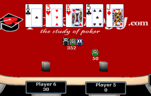 Spiller 6 har kun $ 10, men han kan kalde på sine sidste $ 10 (og ville derfor være “all in”) eller folde. Hvis spiller 6 beslutter sig for at gå all in for sine sidste $ 10, kan den sidste aktive spiller (spiller 7), der har $ 50, vælge at kalde, men han skal kræve $ 20, som er den oprindelige indsats, eller han kan vælge at hæve. Hvis han kalder, oprettes der en sidepotte, som det er vist i figur 5 nedenfor: